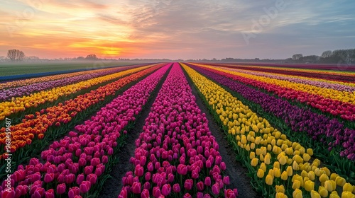 Colorful Tulip Fields at Sunset