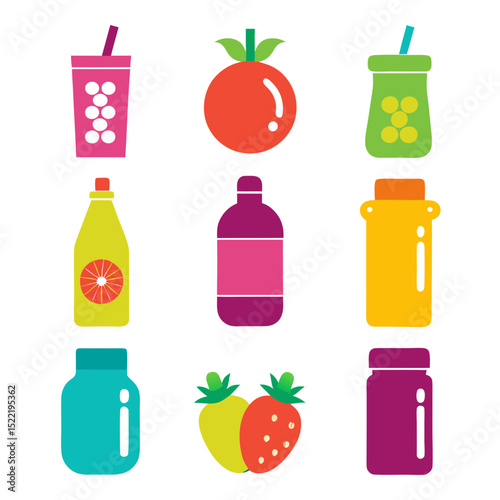 fruit, drink, icon, vector, food, juice, bottle, cup, strawberry, tomatoes, pattern, graphic, colourful, illustration, flat, design, healthy, orange, beverage, liquid, collection, set, fresh, summer, bright, modern, symbol, shape, isolated, white, green, pink, yellow, purple, water, sweet, simple, cute, art