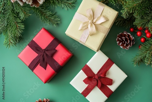 Colorful wrapped gifts nestled among pine branches for a festive holiday ambiance.