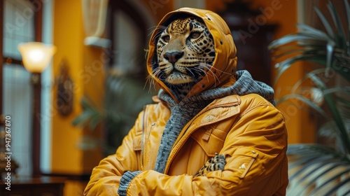 man, humor, cheerful, amusing, silly, performer, leopard print, rythm, festive, groovy, mask, spotlight, excitement, animated, playful, comical, laughter, movement, party, ridiculous, entertaining, yellow background, show, costume, dinosaur, beat, absurd, hilarious, lively, motion, happiness, joy, fun, action, music, energy, activity, stage, theatrical, dynamic, funny, entertainment, talent, goofy, performance, vibrant, celebration, dance