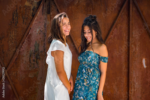 Complicity moment, relaxed women enjoying sun in front of a rusty metal gate , enjoying beautiful nature, freedom and life at campaign. Concept of vacations, freedom, friendship, happiness.
