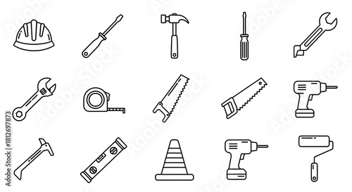 Comprehensive collection of construction and handyman tools as line art icons, perfect for building projects, DIY, repair, and engineering illustrations