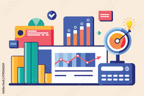 Computer screen showing a clock with various items around it, Analyzing bank credit card data trending, Simple and minimalist flat Vector Illustration