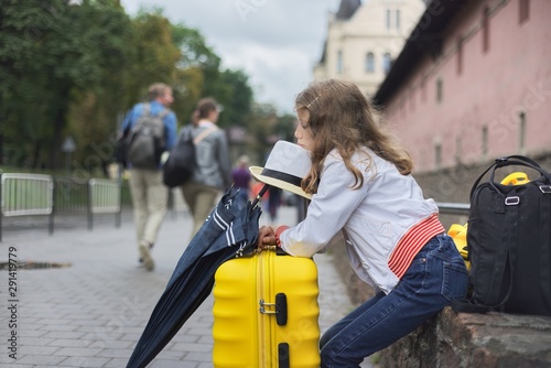 travel, suitcase, tour tourism, girl, children, children, city, female, sitting, vacation, trip, woman, baggage, holiday maker, bag, baggage, lifestyle, children, person, people, beautiful, journey, holiday, traveler, summer, fashion, street, happy, passenger, adventure, view, urban, background, 1, transportation, caucasian, travelling, portrait, casual attire, transport, looking, beauty, white, hat, attractive, waiting, yellow, plastic, umbrella