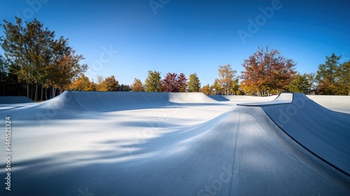 skatepark, ramp, concrete, autumn, foliage, park, tree, skate, recreation, urban, landscape, curve, structure, design, sunny, daytime, blue, vibrant, clear, sky, modern, facility, skateboarding, lifestyle, activity, surface, pattern, geometric, shape, ground, culture, nobody, public, space, nature, seasonal, change, fall, season