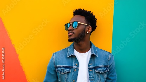 man, denim, jacket, urban, graffiti, wall, confident, trendy, standing, fashion, style, portrait, casual attire, bold, blue, vibrant, city, street, background, modern, cool, youthful, lifestyle, attitude, young, male, pose, outfit, coloured, graphic
