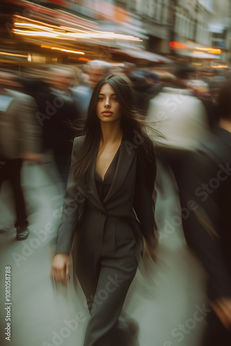 brunette, woman, pantsuit, stylish, city, street, bustling, urban, confidence, fashionable, modern, tied-up, light, blur, walking, chic, grace, movement, scene, atmosphere, elegant, fashion, professional, portrait, contemporary, lifestyle, business, crowd, action, motion, sophistication, city landscape, dynamic, self-assured, attire, outfit, metropolitan