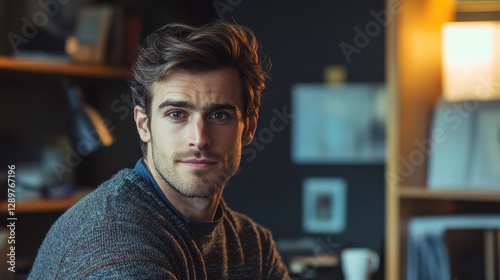 man, portrait, confident, indoor, calm, photogenic, home, lifestyle, business, editorial, expression, attractive, male, adult, person, looking, face, head, shoulder, sweater, hair, style, smart, light, background, room, model, posing, inside, cosy, relaxation, content, marketing, presentation, digital, advertisement, artistic, elegant, young, casual attire