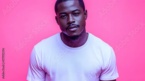 man, portrait, pink, fashion, style, t-shirt, pose, confident, vibrant, modern, male, model, studio, background, minimalist, bold, colours, person, young, adult, casual attire, clothing, simple, clean, stylish, expression, face, head shot, photo, image, visual, aesthetic, trendy, contemporary, cool, attitude, masculine, posing, colours, white shirt, studio shot, front view, serious, calm, relaxed