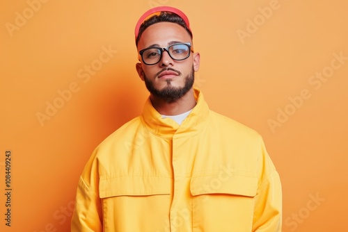 Confident Young Man in Bright Yellow Jacket and Red Cap Posing Against Vibrant Orange Background with Stylish Glasses and Contemporary Fashion Sense