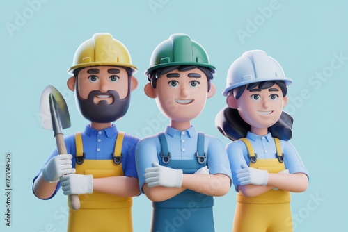 animation, cartoon, team, trowel, blue shirt, bearded man, young men, missy, construction site, blue background, teamwork, collaboration, industry, building, building site, construction equipment, safety, safety-gear, professional, job site, workwear, work boot, work attire, labor
