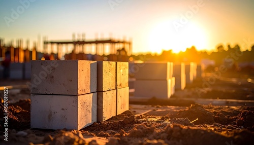 construction, site, sunset, block, concrete, brick, building, foundation, ground, earth, dirt, sun, light, orange, gold, horizon, sky, afternoon, evening, framework, structure, building material, industrial, progress, daylight, landscape, closeup, sharpened, blur, construction site, laying, block, material, work, gold