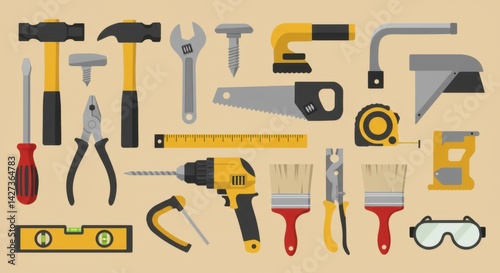 tool, cut, flat, calm, indoor, construction, hammer, drive, modern, neutral, studio, repair, screwdriver, measure, simple, basic, workspace, wrench, paint, clean, organised, renovation, plier, fix, graphic, practical, building, saw, build, vector, useful, project, drill, adjust