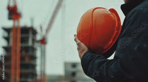 Construction worker holding his helmet while looking at construction site. Occupational Safety and Health (OSH)