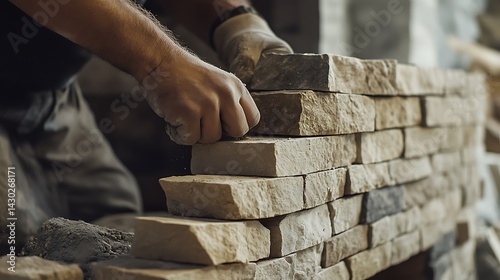 Construction Worker Laying Stone Bricks