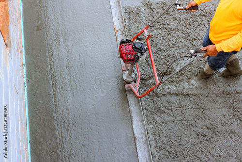 Construction worker operates concrete finishing machine on smooth surface during leveling concrete