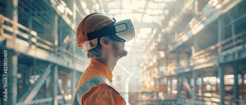 Construction worker using virtual reality headset in warehouse, showing the integration of technology in industrial and construction environments.