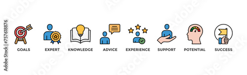 Consulting banner web icon vector illustration concept for business consultation with an icon of goals, expert, knowledge, advice, experience, support, potential, and success