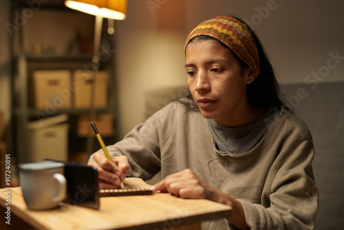woman, writing, note, living room, cosy, headband, lamp, notepad, crayons, sharpened, hispanic, serious, indoor, home, furniture, casual attire, seated, planning, notebook, reflect, pensive, interior, thoughtful, table, illumination, concentration, workspace, solitary, organised, recording, peaceful, desk, creativity, thinking, night time, domestic, relaxation