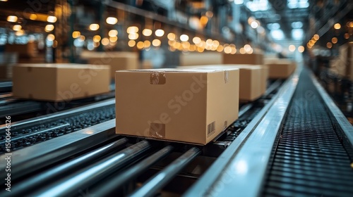 Conveyor belt loaded with cardboard boxes in a distribution center, blurred lights above