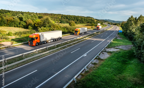 Convoy of Trucks with containers on highway, cargo transportation concept in springtime - freight service