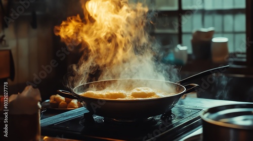Cooking dumplings in a pan with steam and flames in a warm kitchen setting.