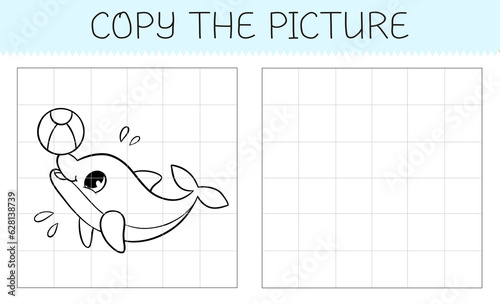 Copy the picture is an educational game for kids with cute dolphin with ball. Cute cartoon dolphin coloring book.