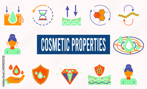 Cosmetic properties minimal solid web icon set with Anti Age, Cell Regeneration, Nutritious, Skin Protection and more. Vector illustration eps10.