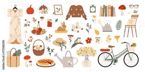 decoration, nature, flower, cute, leaf, simple, bungalow, core, aesthetic, cosy, design, background, composition, vector, graphic, flat, element, set, collection, icon, teapot, apple, apple pie, sweet, dessert, vase, floral, bike, bicycle, book, watering can, pumpkin, basket, dress, goggles, sweater, rabbit, rabbit, animal, hat, house, mushroom