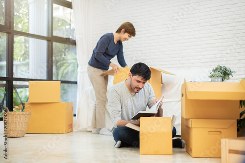 unpack, couple, box, cardboard, cardbox, home, moving, new, asian, chinese, japanese, apartment, brick, buying, camera, carrying, casual attire, caucasian, cheerful, day, delivery, diversity, enjoying, estate, family, happiness, happy, holding, house, indoor, interior, lifestyle, looking, love, man, mortgage, owner, packing, person, planning, portrait, property, real, relocation, residential, smiling, white, woman, young