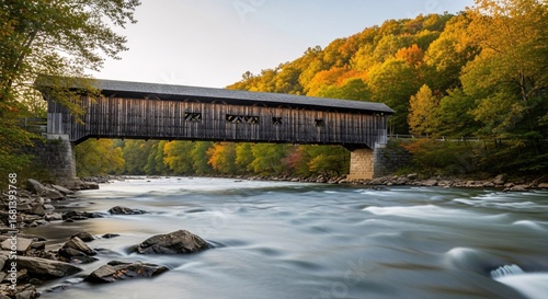 Covered bridge over a flowing river in autumn with colorful trees