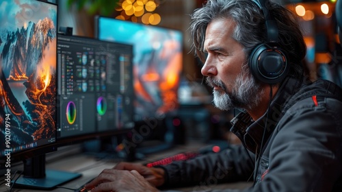 digital, nomad, wellness, efficiency, sharpened, man, earphones, work, computer, art, screen, creative, workspace, seminar, gym, plant, calm, job, warm, glasses, grey, pen, green, hair, coach, mug, desk, tech, room