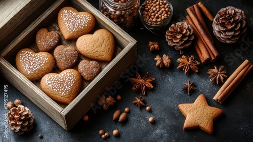Cozy and Inviting Box of Heart-Shaped Gingerbread Cookies Surrounded by Pine Cones, Cinnamon Sticks, and Star Anise for a Warm Holiday Feel