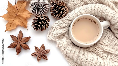hot drink, mug, autumn, pine, cone, leaf, knit up, sweater, warming, cosy, natural, decoration, star, anise, season, hot, drink, fall, relaxation, comfort, brown, aesthetic, home, style, beverage, lifestyle, wood, texture, indoor, arrangement, foliage, nature, warmth, inviting, festive, rustic, simple, beauty, morning, tea, design, aromatic, composition, vintage, simplicity, harvest, atmosphere, decor