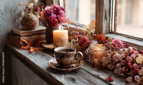 window, sill, autumn, hot drink, candle, flower, decor, book, warm, light, cosy, dried, fall, autumn, rustic, vintage, home, interior, still, life, arrangement, candleholder, cup, saucer, dried flowers, vase, natural, decorative, relaxing, warmth, texture, wooden, autumn leaf, gentle, soft, natural light, amber, muted, detail, sharpened