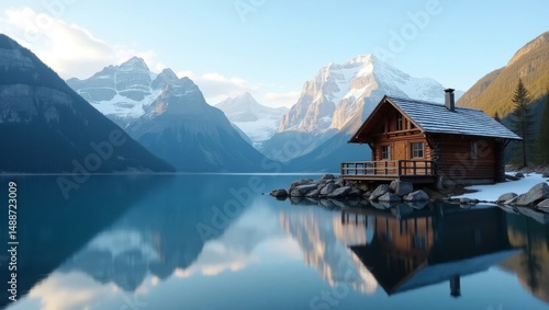 Cozy Cabin by the Lake Surrounded by Mountains at Sunset in a Tranquil Landscape With Reflections in the Water