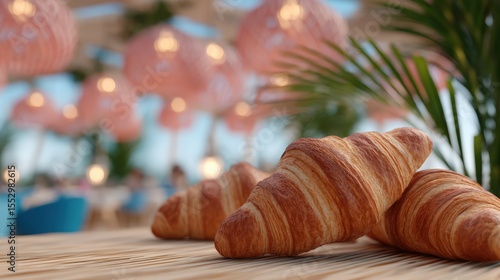 Cozy Cafe Setting with Freshly Baked Croissants on a Wooden Table