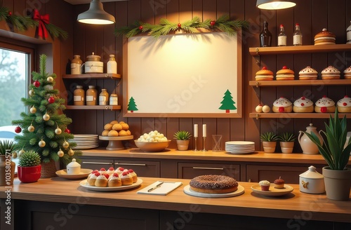 Cozy café with festive holiday decorations, featuring a blank menu board, perfect for promoting seasonal offerings or holiday-themed café ads