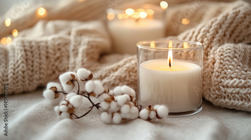 Cozy Candles and Cotton Blooms. A cozy scene with lit candles, cotton blooms, and knitted textures creates a sense of warmth and relaxation.