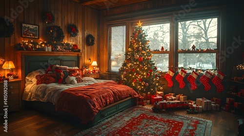 Cozy Christmas bedroom with festive tree and toy train