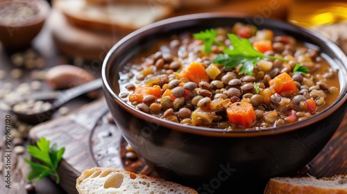 Cozy Comfort Food - Delicious bowl of hearty lentil soup served with crusty bread, perfect for a warm and comforting meal on a cold day.