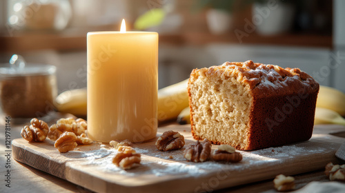 Cozy homey scene featuring candle beside slice of banana bread, surrounded by walnuts and sprinkle of flour