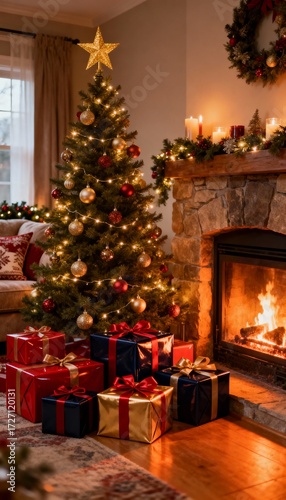 cosy, living room, christmas, tree, decorated, ornament, light, star, gift, wrapped, red, gold, ribbon, fireplace, stone, ember, warm, glow, sofa, cushion, garland, candle, festive, holiday, interior, home, seasonal, celebration, twinkle, comfy, relaxing, inviting, cheerful, winter, bright, illumination, traditional, elegant, decorative, decoration, room, christmas tree, christmas, fire, present, gift, decoration