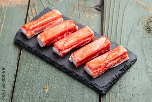 Crab sticks from fish surimi photography . Top view