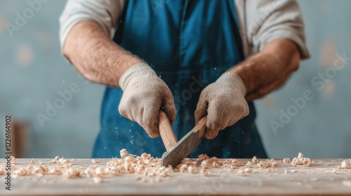 Craftsmanship in Progress: Woodworker Shaping Material with a Chisel and Careful Precision
