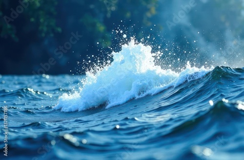 crashing ocean wave in bright sunlight with lush green coastline in background. concept of nature's power and tranquility. natural background with copy space