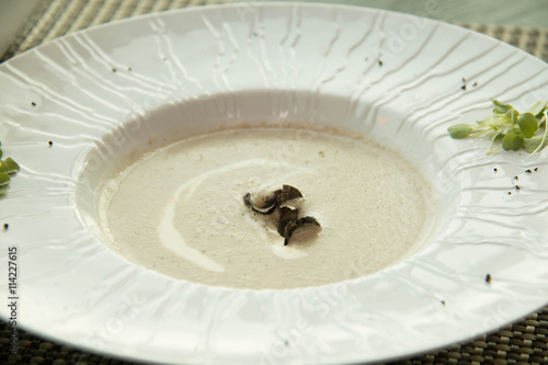 soup, mushroom, white, cream, food, bowl, vegetable, dinner, vegetarian, lunch, cookery, epicure, champignon, background, closeup, dish, plate, meal, delicious, tasty, cooked, course, delicacy, blended