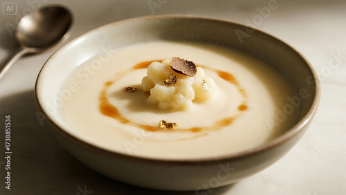Creamy Cauliflower Velouté Served In A Shallow Porcelain Bowl, Garnished with Truffle Oil Drizzle and Edible Gold Flakes