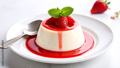 dessert, cotta, strawberry, fresh, red, sweet, creamy, italian, delicious, food, plate, spoon, fruit, smooth, white, elegant, epicure, luxury