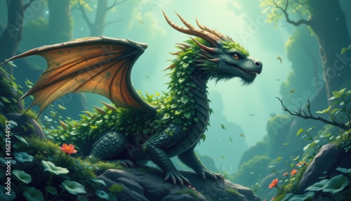 create a digital illustration of an ancient forest dragon covered with green plants, set against a backdrop of sparkling teal tones